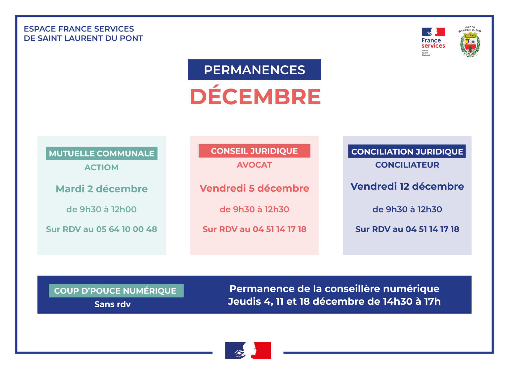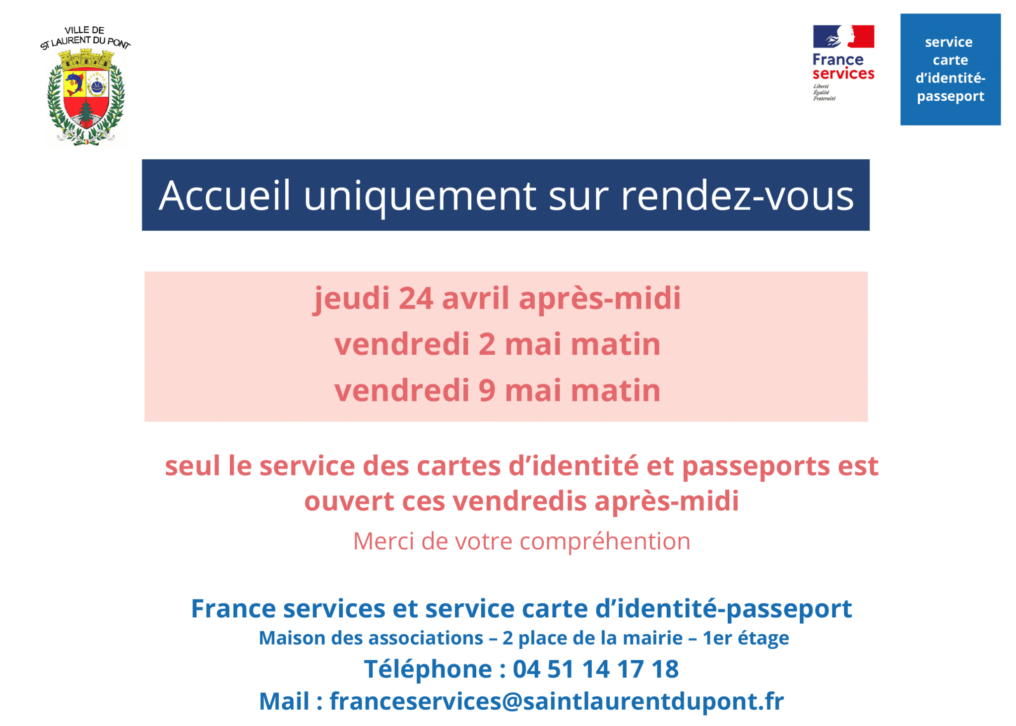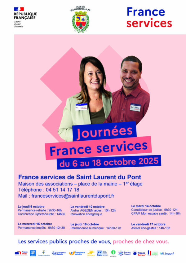Dans le cas où la France Services n’est pas joignable par téléphone, merci d’envoyer un e-mail à franceservices@saintlaurentdupont.fr (réponse sous 48h ouvrées)
